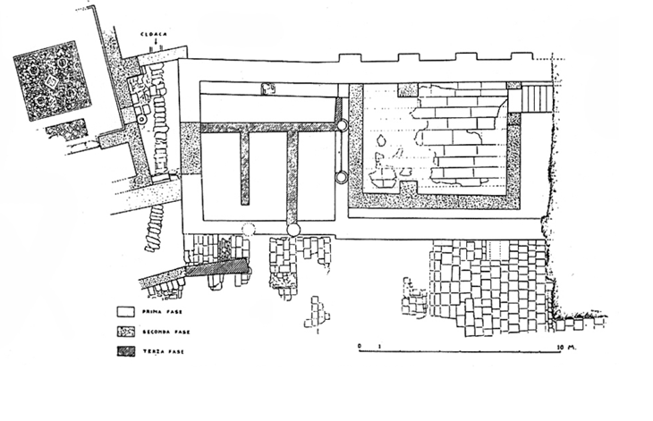 La prima fase edilizia risale al 150-200 d.C. ed è costituita da un porticato (N-S) sorretto da colonne che si affacciavano su una strada lastricata; una di queste colonne è oggi incassata sul muro moderno. Un muro di blocchi di pietra locale, visibile dietro i piloni moderni, delimitava il porticato. Fra le basi di due colonne che si conservano in loco è possibile intravedere l’ingresso laterale di un edificio (soppiantato dall’ambiente su podio di seconda fase e successivamente da un pilone moderno) messo in evidenza dalla colarata pavimentazione in marmo, ormai scomparsa.