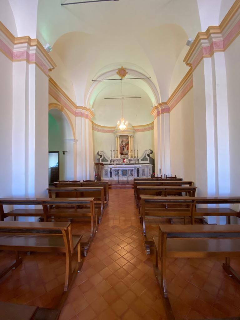La pianta della chiesetta prospetta uno schema planimetrico ad unica aula con prevalente sviluppo longitudinale e copertura a botte. L’interno della chiesa presenta un ampio presbiterio concavo che ingloba a muro l’unico e ricco altare dai variegati marmi. Nella pavimentazione della chiesa con prevalenza in cotto moderno, rimangono tracce dell’antico pavimento, (anch’esso in cotto). Una scalinata permette di accedere alla chiesa anche sul lato dx, dove, edificata su tre archi, è sita la sagrestia di forma rettangolare, eretta dopo la II guerra mondiale.