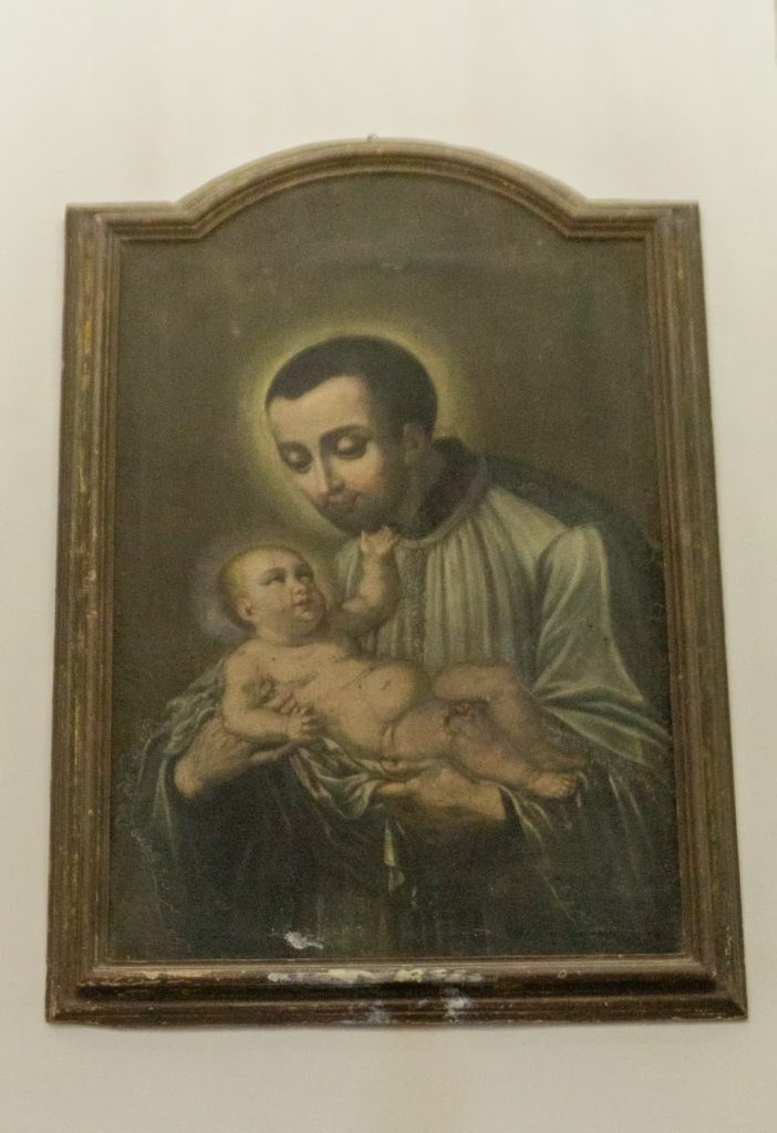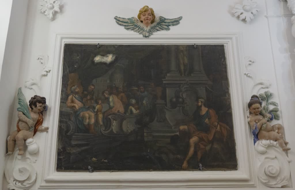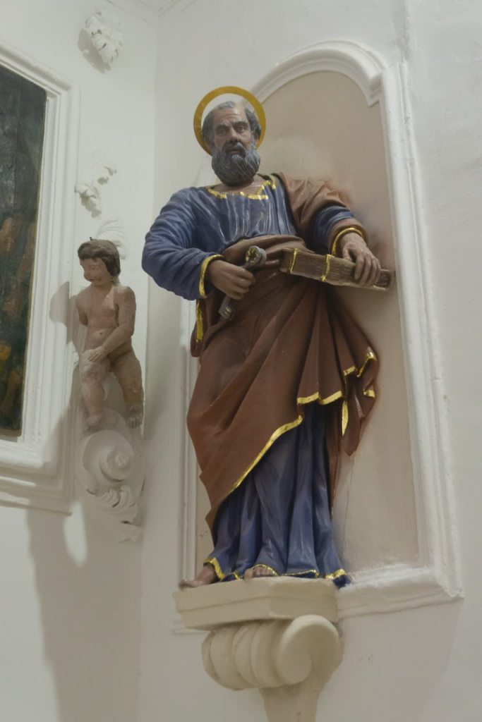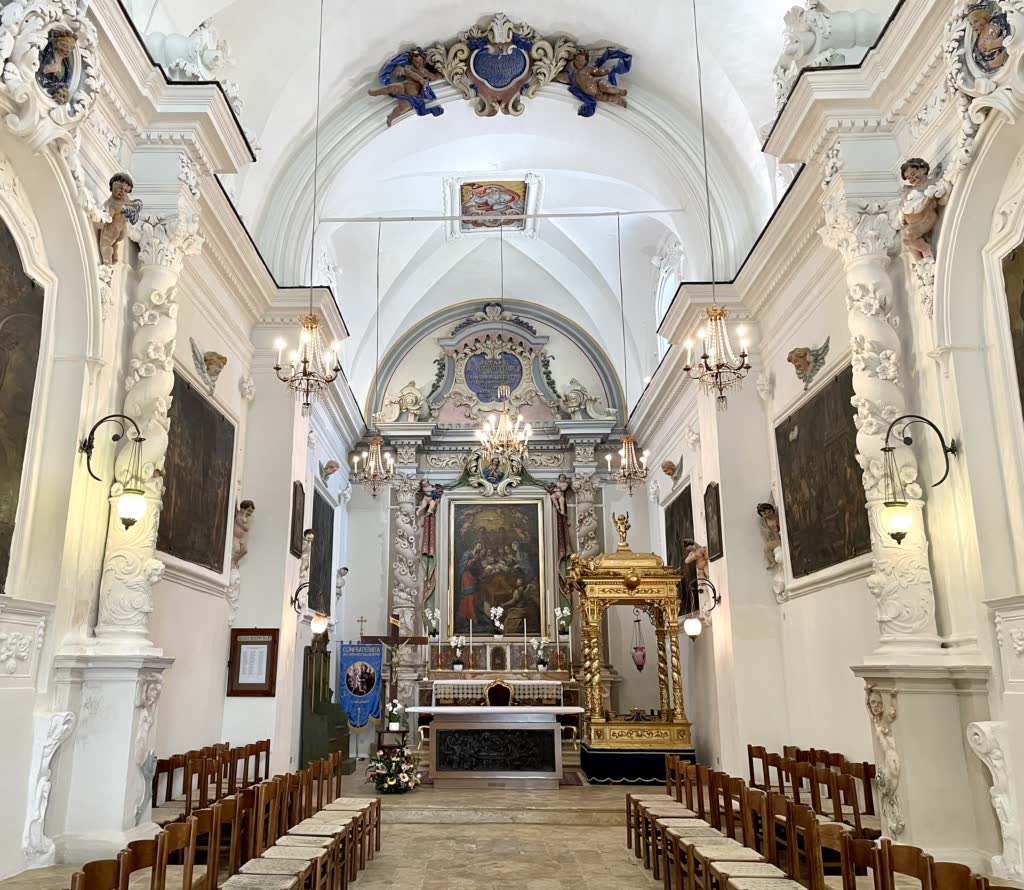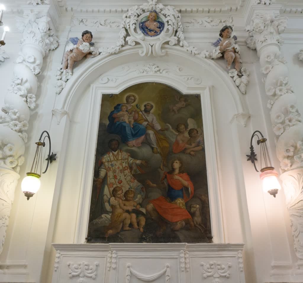 Più avanti, sempre sulla destra, l’altra tela raffigurante la parabola “del ricco e Lazzaro”, con putti laterali. Ai lati dell’altare principale ci sono altre due tele: quella di San Gaetano con il Bambino in braccio e quello di San Francesco da Paola, quella con scena bibliche e una che raffigura probabilmente Tobia.
