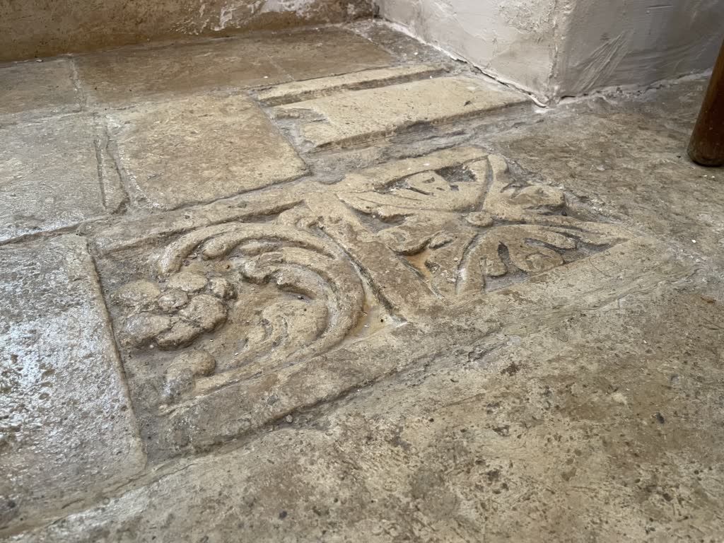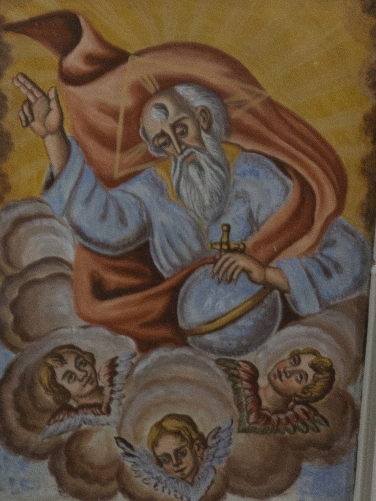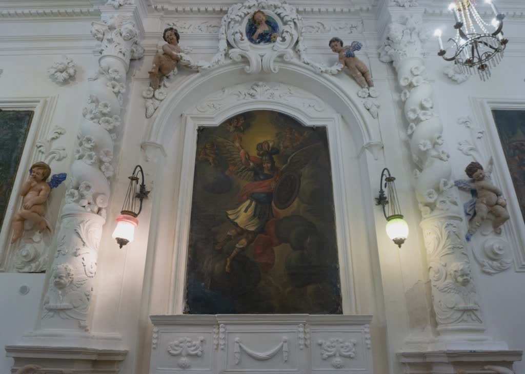 Sulla volta troviamo un affresco raffigurante il “Dio Creatore “. Entrando alla sinistra della navata troviamo un altare con colonne tortili, putti e decorazioni in stucco e una tela raffigurante San Michele Arcangelo. Sopra questa tela, in altorilievo, una rappresentazione di Santa Rosalia con due putti laterali. Su questo stesso lato merita particolare attenzione “la Confraternita”, una panchina con spalliera lavorata in stile barocco, che prende questo nome, per l’appunto dai confratelli che vi sedevano nelle riunioni parrocchiali. Il pavimento in pietra bianca è quello originario, uno dei pochi rimasti in Sicilia.