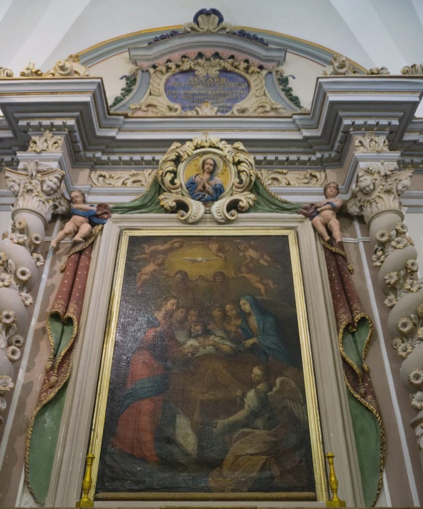 Entrando notiamo due statue in stucco che rappresentano i Santi Pietro e San Paolo. Ai due lati della navata due tele non documentabili, mentre proseguendo a destra abbiamo un altare molto ricco, con colonne tortili, putti e vari affreschi. In questo altare c’è una tela che rappresenta la Sacra Famiglia con San Vito e San Filippo di Agira e nella decorazione superiore in altorilievo ( in stucco ) è rappresentata Sant’ Agata.