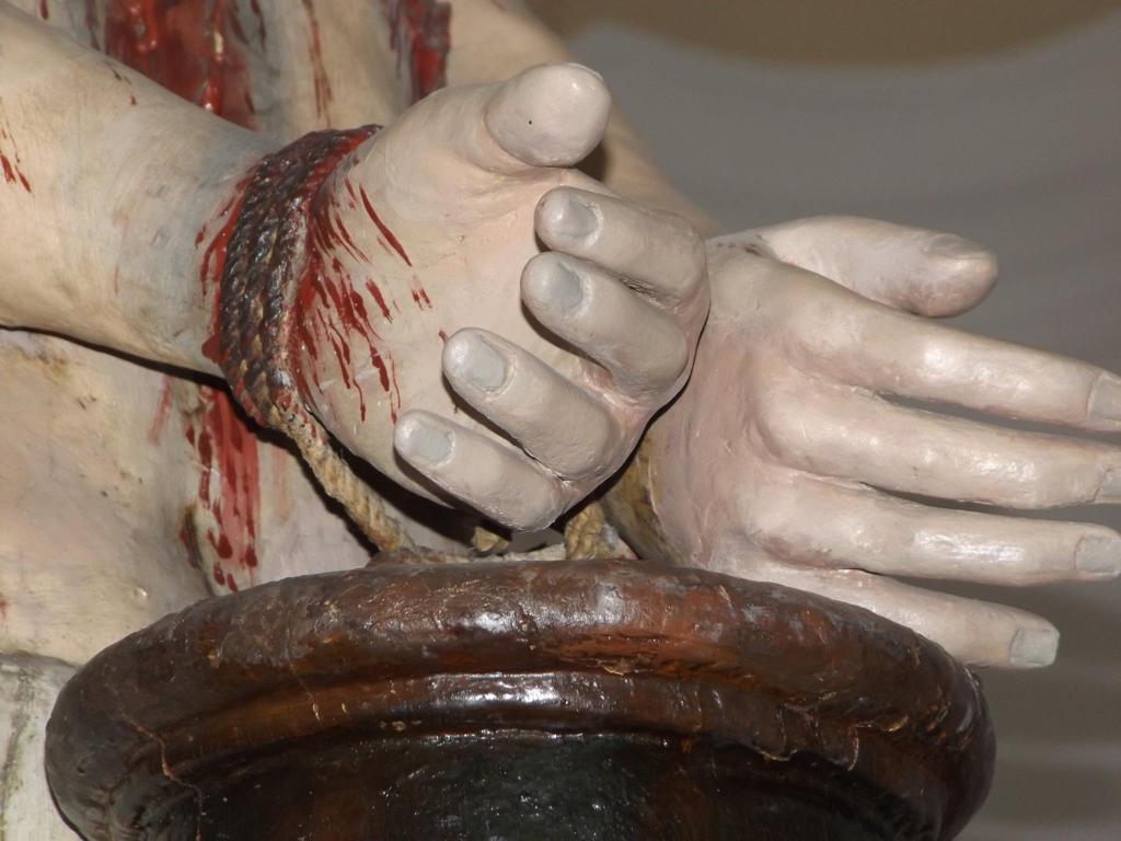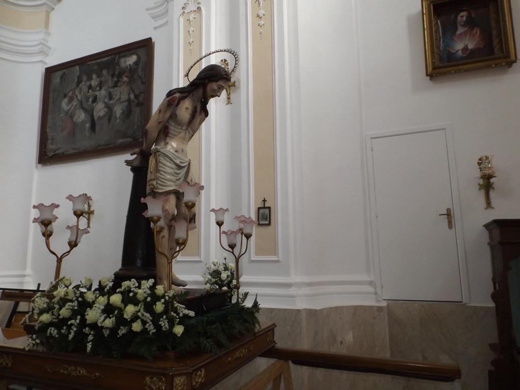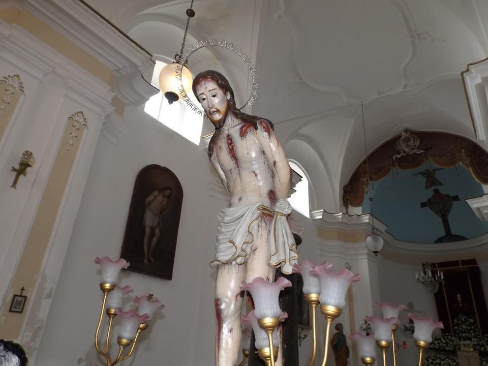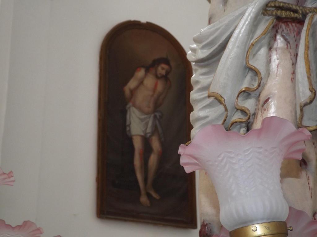 Sulla sinistra altre due tele: la prima raffigura la Madonna del Rosario ( 1891), la seconda rappresenta una copia identica della statua in legno del Cristo alla colonna, disegnata su tela. Particolare attenzione merita la sopracitata statua del Cristo alla colonna; l’opera, realizzata interamente in legno, è un capolavoro artistico del XVII secolo ricco di pathos e dalle realistiche espressioni di sofferenza e dolore che, i dettagli delle e sulle ferite, sembrano riuscire a trasmettere.