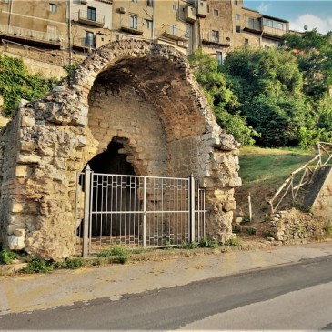Se per il monumento intitolato a Corradino l’abbassamento del piano di campagna avevo lasciato scoperte le fondazioni e il podio, qui succede il contrario: un innalzamento del piano di campagna ha comportato l’interramento di almeno 4 m dell’intera struttura. Il podio e parte delle pareti del piano superiore sono nascosti dunque. A differenza del castello di Corradino inoltre, qui si è mantenuta la copertura, voltata a botte. Il fronte è completamente andato perduto (consentendo l’osservazione dell’interno), mentre esiste ancora la parete di fondo.