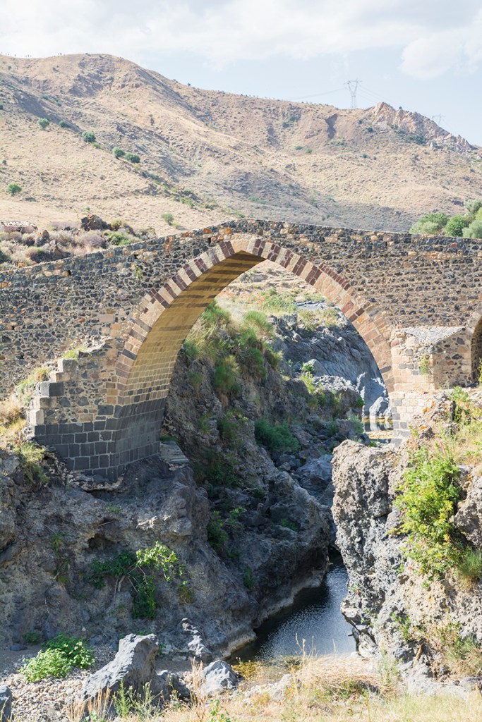 Fu costruito in epoca romana, in muratura, della quale ci rimangono le basi dell’arco maggiore. Successivamente, con l’occupazione islamica, gli Arabi lo rifecero probabilmente per ripristinare l’attività del ponte a seguito di un crollo dovuto forse ad una piena del Simeto. Così sostituirono all’arte romana i canoni della loro architettura, curando gli effetti cromatici, con l’alternanza di pietre chiare e scure nelle ghiere degli archi.