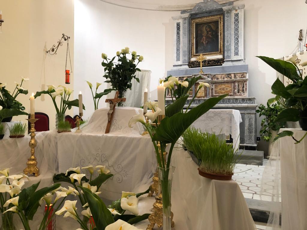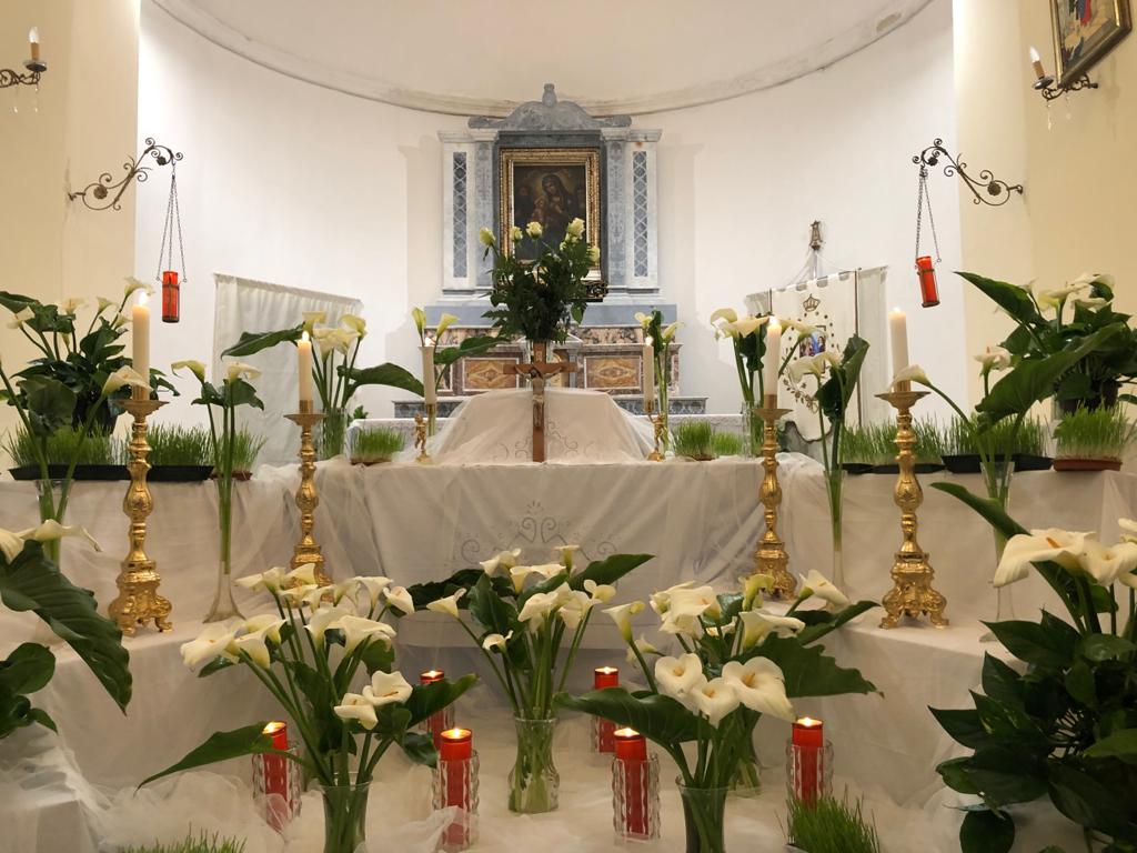La Chiesa, a navata unica, presenta un abside decorata nel 1935, da pitture ad olio ad opera del pittore centuripino Salvatore Aricò, oggi andate perdute. Entrando a destra troviamo una tela raffigurante Sant’ Emidio, protettore contro i terremoti, a sinistra è visibile una tela raffigurante un angelo custode. Sull’altare centrale è custodita la tela con la Madonna delle Grazie ( già Madonna della Grotta ) nell’atto di allattare il bambin Gesù che regge il globo, conai lati Santa Monica e Sant’Agostino. Il dipinto è stato per secoli venerato da tutto il circondario e ogni 8 settembre, giorno in cui ricorre la festa della Madonna delle Grazie, viene portata con devozione in processione per le vie del paese.
