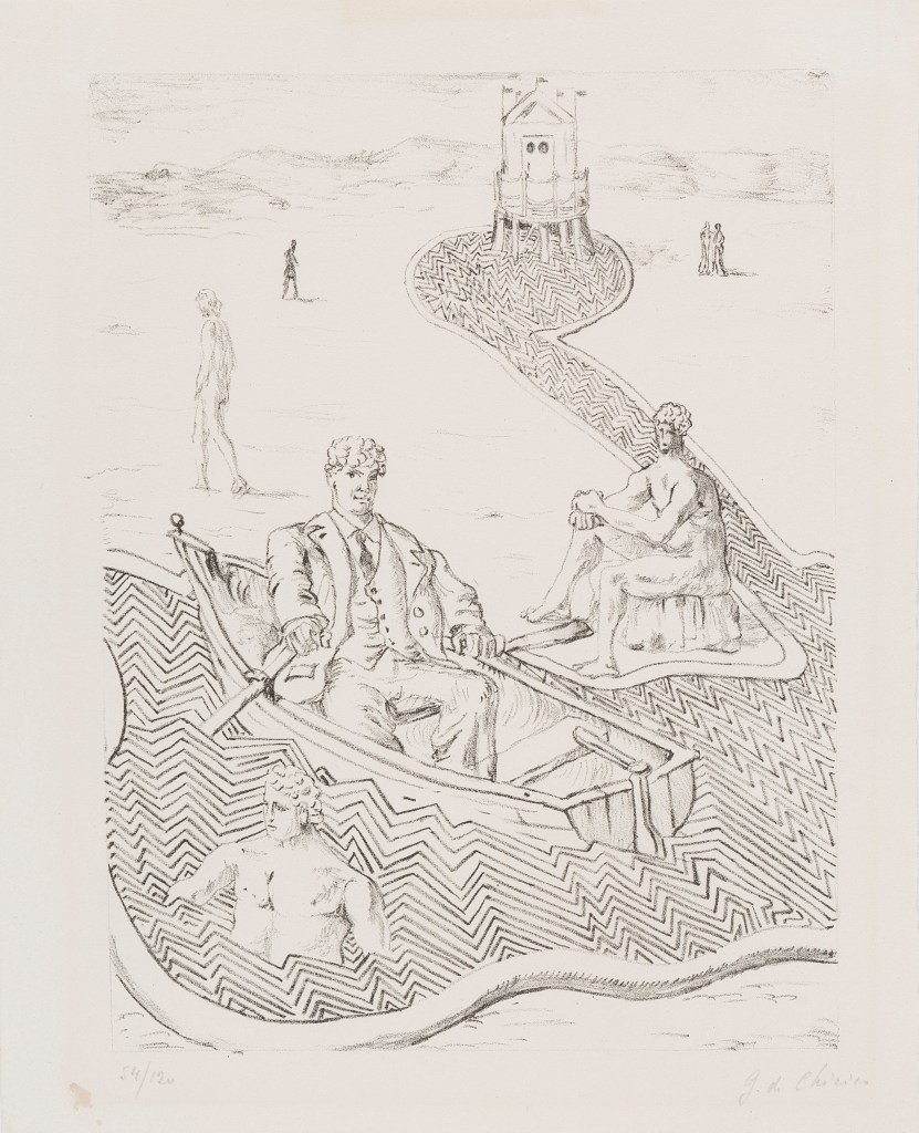 - Giorgio De Chirico, La fuga inspiegabile, 1934, litografia,241 X 180 mm,130 esemplari, Ciranna n.87