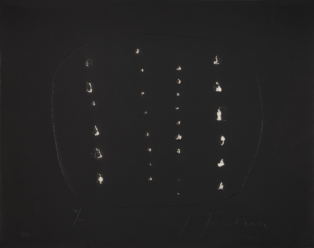 - Lucio Fontana, Concetto spaziale, 1964, acquaforte, buchi e goffrature, 500 X 635 mm, 61 esemplari, Rigo n. E-18