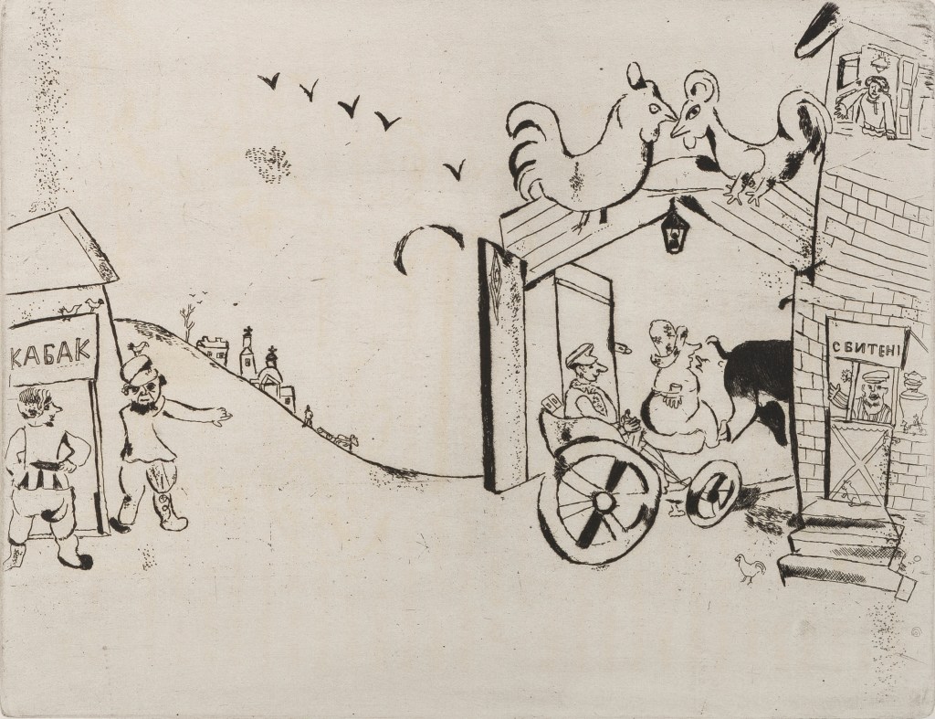 - Marc Chagall, Chichikov Arrives in Town, 1927-1930, acquaforte, 221 X 284 mm, 368 esemplari, Sorlier n.2