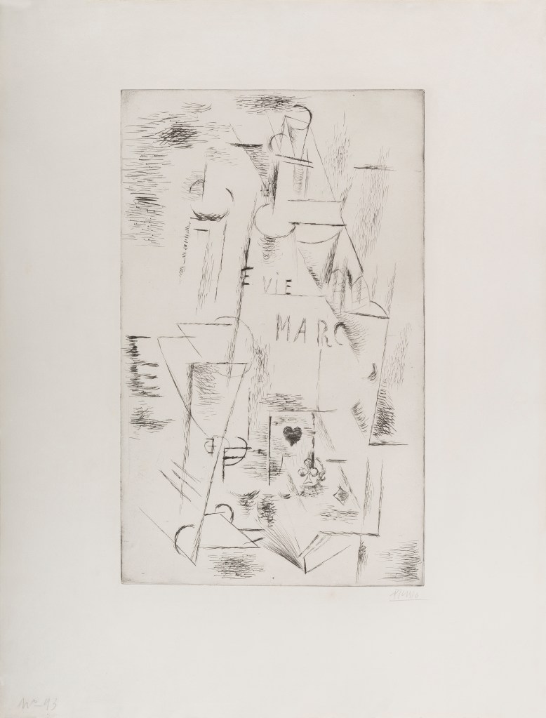 - Pablo Picasso, Nature morte á la bouteille de Marc, 1911, puntasecca, 500 X 360 mm, 100 esemplari, Geiser n.33