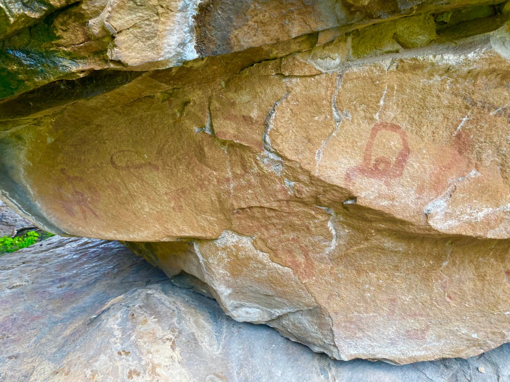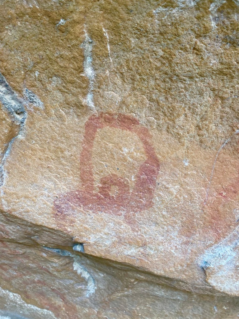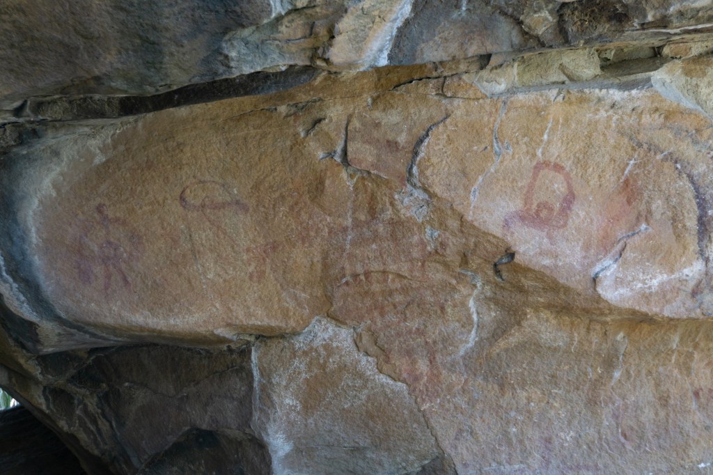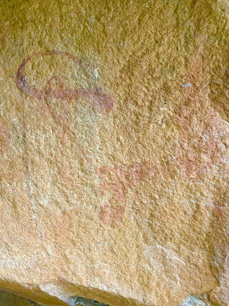La scena in ocra rossa sembrerebbe appartenere a un periodo più tardo, con buona probabilità all’età del bronzo. Si individuano una serie di figure antropomorfe, da sinistra verso destra, con un grado di semplificazione e astrazione crescente. Le figure prima provviste di arti vengono poi semplicemente raffigurate come dei quadrati smussati muniti di testa all’interno. La curiosa forma sembra dovuta ad una stilizzazione di persone oranti o in festa con le braccia alzate. Le figure antropomorfe si distribuiscono attorno ad un grande disegno centrale che ne costituisce il fulcro, molto complesso che al momento non ha fornito elementi chiari di decifrazione. Potrebbe rappresentare una grande costruzione, forse una capanna/sacello oppure una figura importante come una divinità o una persona di rilievo della comunità. Il disegno ha alcuni tratti in comune con le figure stilizzate antropomorfe ma presenta una maggiore ricchezza e complessità dovuta anche ad una struttura a reticolo che potrebbe rappresentare le maglie di una veste.