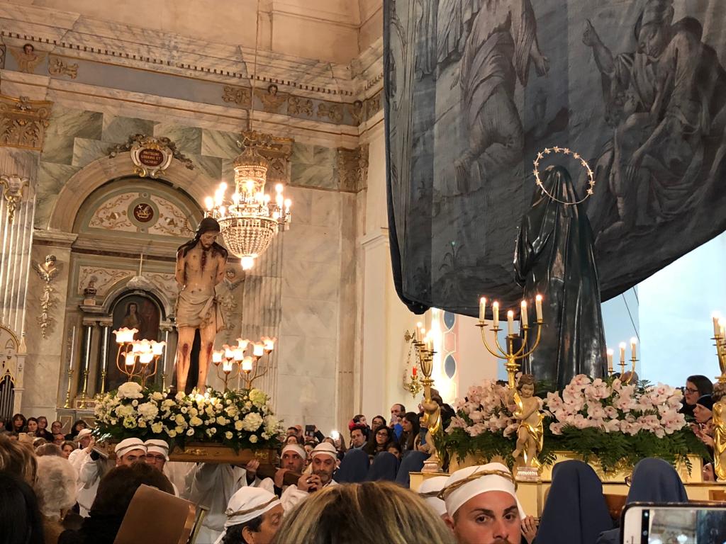 Giovedì Santo, dopo la messa in coena domini,vengono portati in processione l’Ecce Homo, recentemente restaurato, il settecentesco simulacro ligneo del Cristo alla colonna e quello dell’Addolorata, dopo uno dei momenti più straordinariamente emotivi: l’incontro tra Gesù alla colonna e l’Addolorata all’interno della Chiesa Madre.